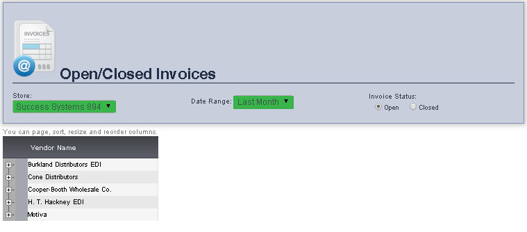 The Open/Closed Invoices page allows you to view open and closed invoices for a particular store, over a specified date range.