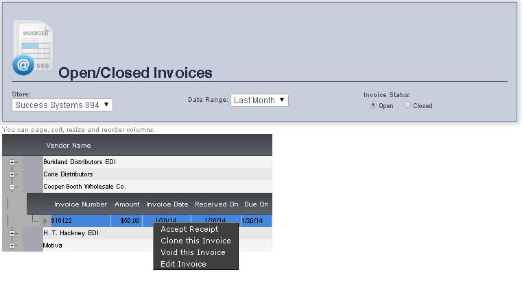 Right clicking an invoice will allow you to either Accept Receipt, Clone this Invoice, Void this Invoice or Edit Invoice.