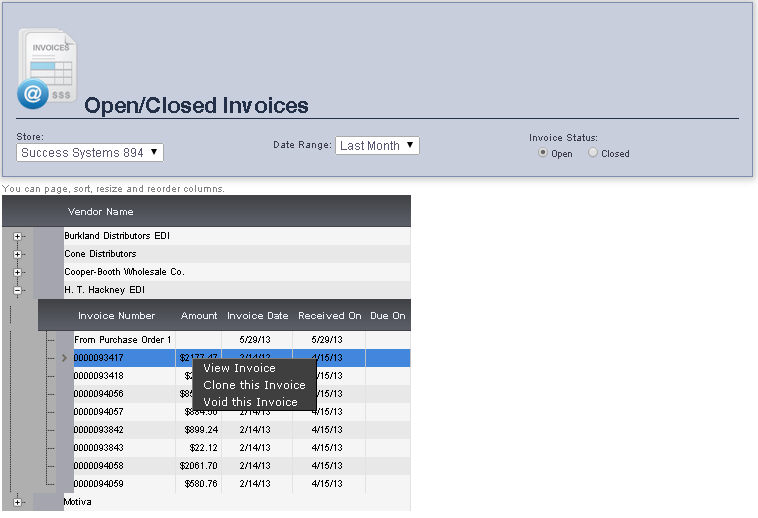 Right clicking an invoice will allow you to either View Invoice, Clone this Invoice, or Void this Invoice.
