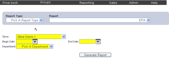 To get to the EPA Report select Reporting from the Main Toolbar and then click View/Print Report. On the View/Print All Report Page, select EPA from the Report drop down menu.