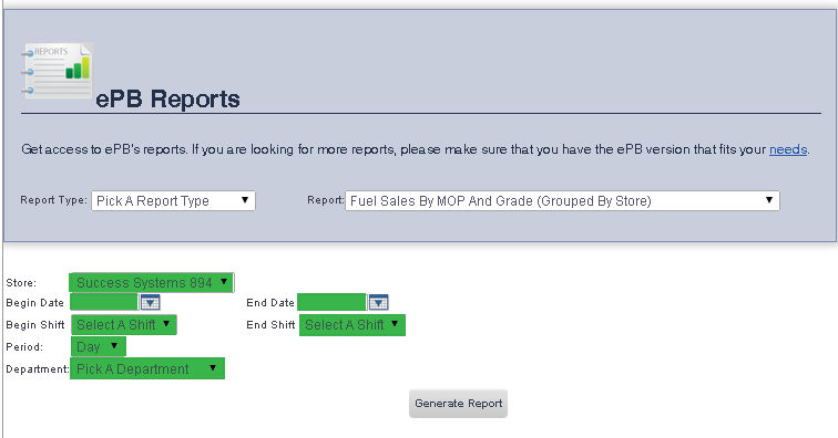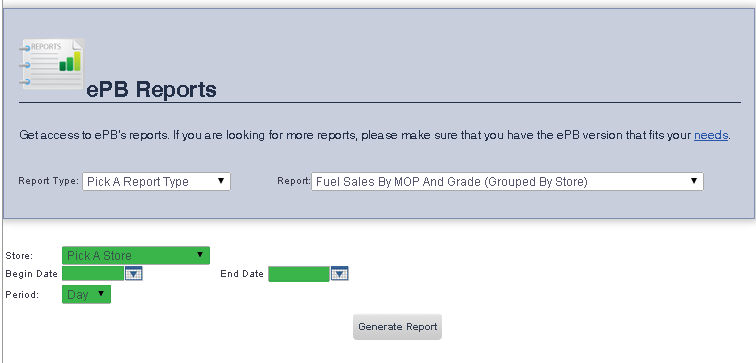 The Fuel Sales By MOP and Grade (Grouped By Store) Report allows you