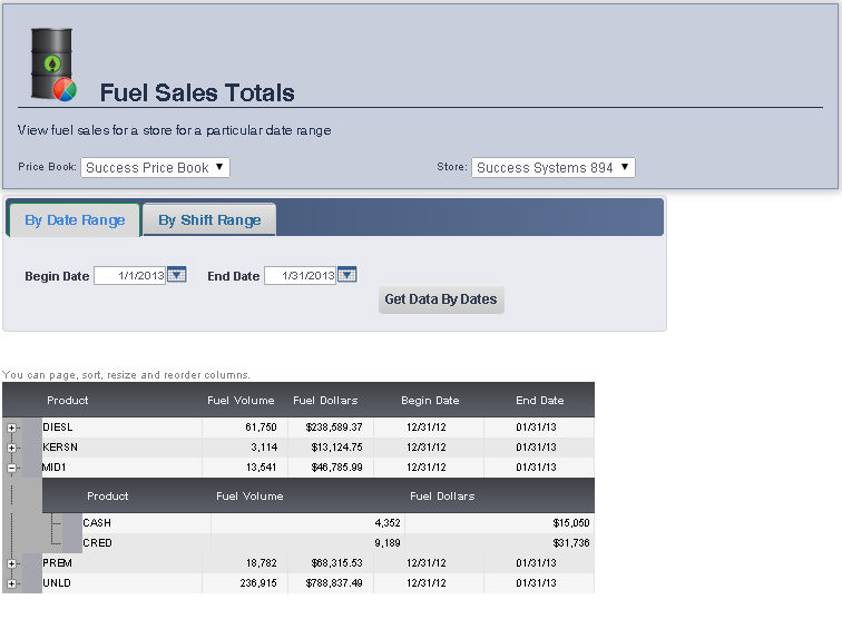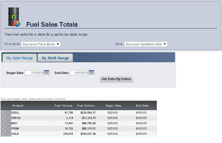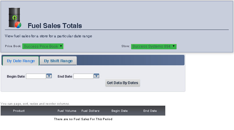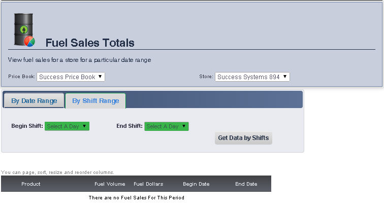 The Fuel Sales Totals page will allow you to view a store's fuel sales by either a particular date range, or a particular shift range.