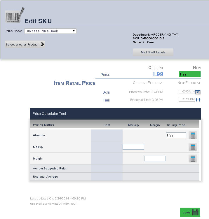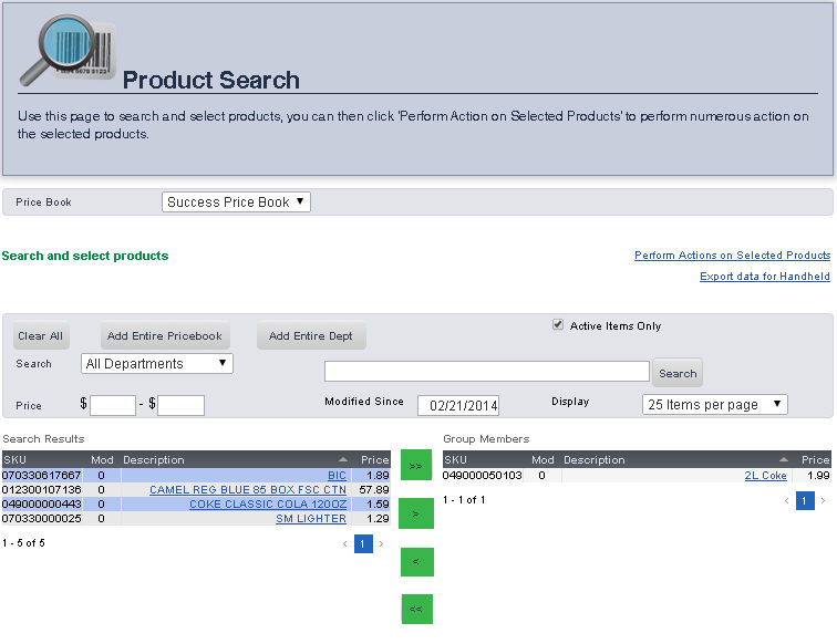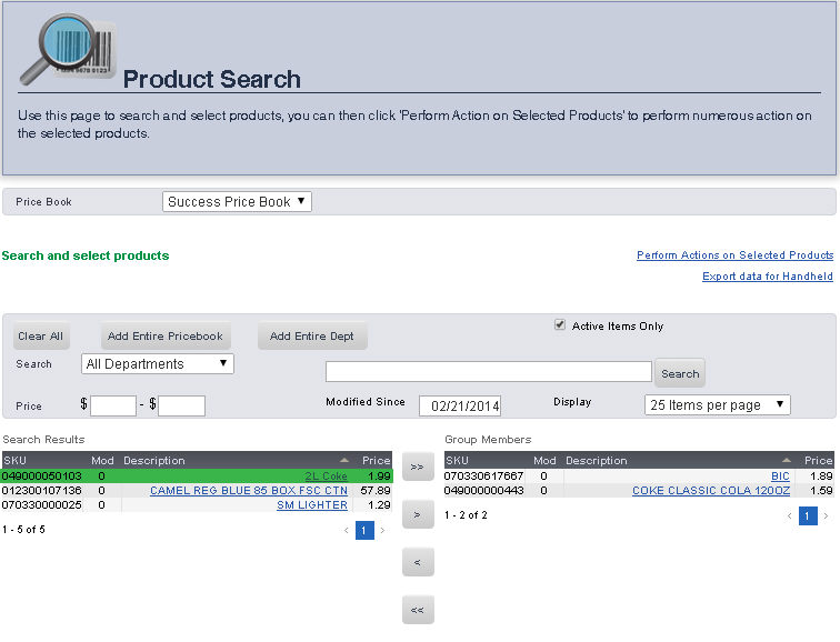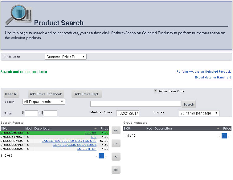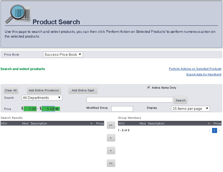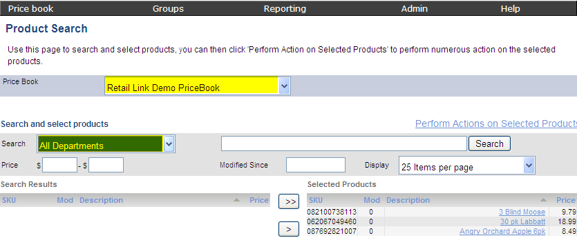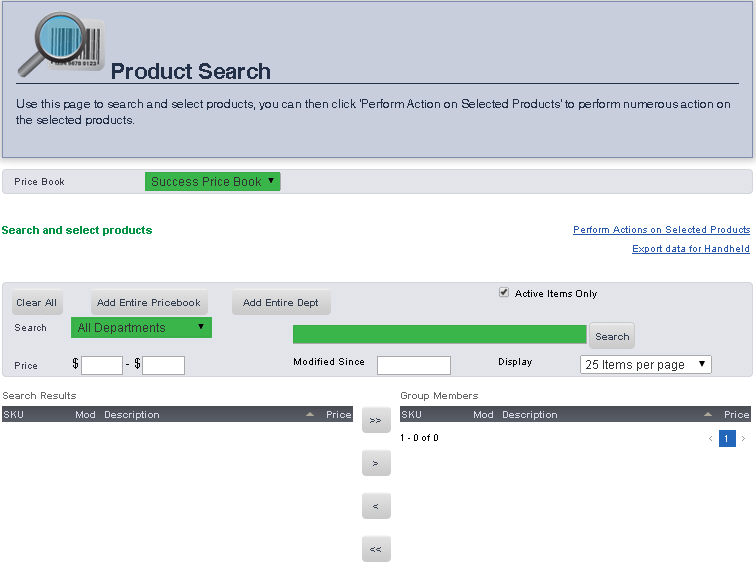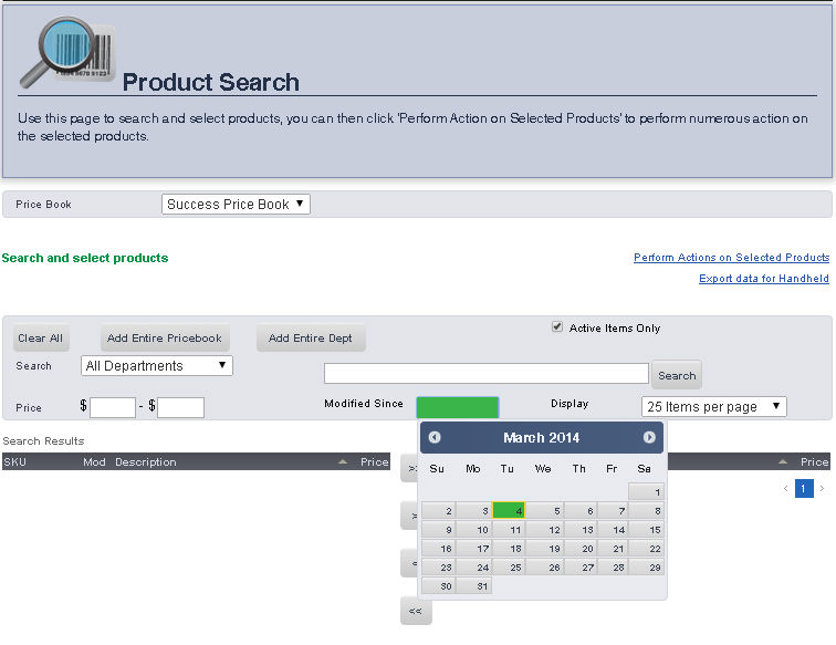 The SKU Search pages allows you to search for an item in a price book by Description, Department, Price, SKU, or by the date it was Last Modified. Once you have searched for the item, you can easily go to the Main Editing Screen for that item, make price changes, print shelf labels, and export inventory.