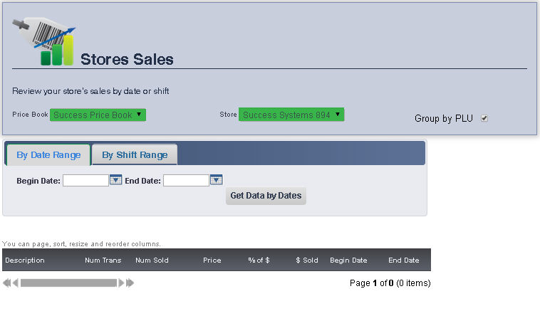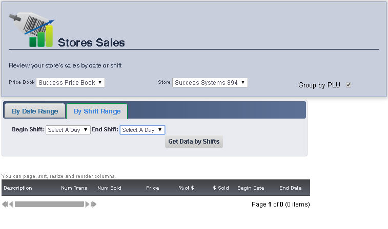 The Sales page allows you to view a store's sales by either a date range or a shift range.