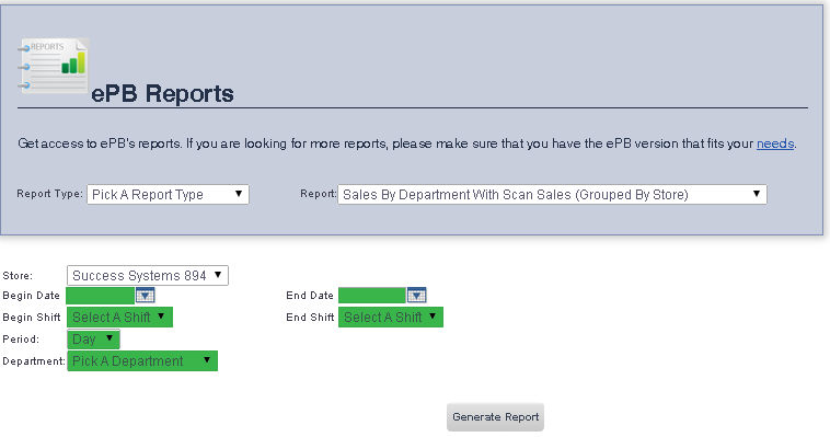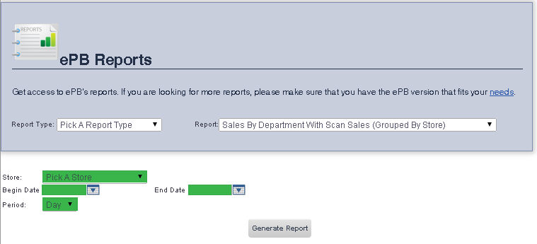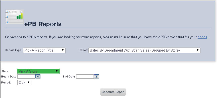 To get to the Sales By Department With Scan Sales (Grouped By Store) Report select Reporting from the Main Toolbar and then click View/Print Report. On the View/Print All Report Page, select Sales By Department With Scan Sales (Grouped By Store) from the Report drop down menu.