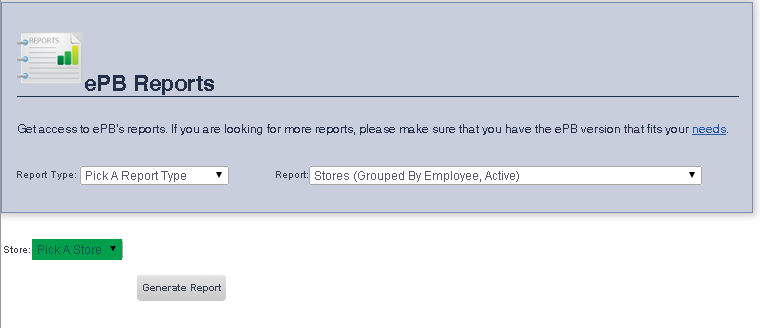 The Stores (Grouped By Employee, Active) Report allows you to view a complete list of all of your stores, sorted by active employees.