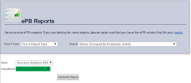 To get to the Stores (Grouped By Employee, Active) Report select Reporting from the Main Toolbar and then click View/Print Report. On the View/Print All Report Page, select Stores (Grouped By Employee, Active) from the Report drop down menu.