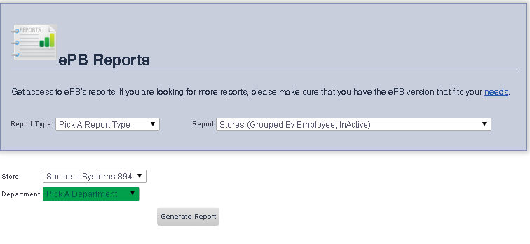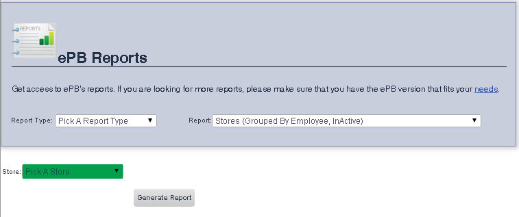 To get to the Stores (Grouped By Employee, Inactive) Report select Reporting from the Main Toolbar and then click View/Print Report. On the View/Print All Report Page, select Stores (Grouped By Employee, Active) from the Report drop down menu.