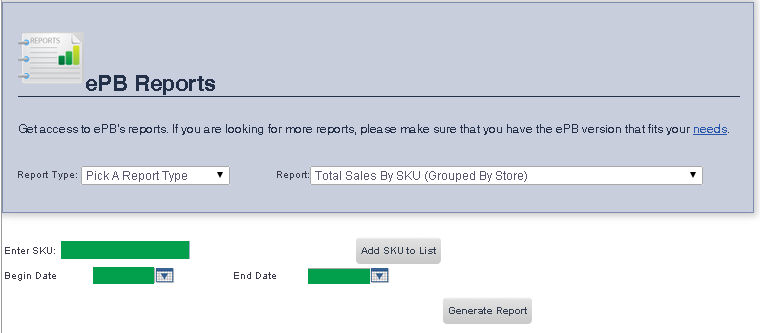 The Total Sales By SKU (Grouped By Store) Report allows you to view total sales for manually entered item SKUs, grouped by store.
